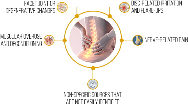 “Back pain” is a category, not a diagnosis. Chronic pain can be driven by multiple factors, including: