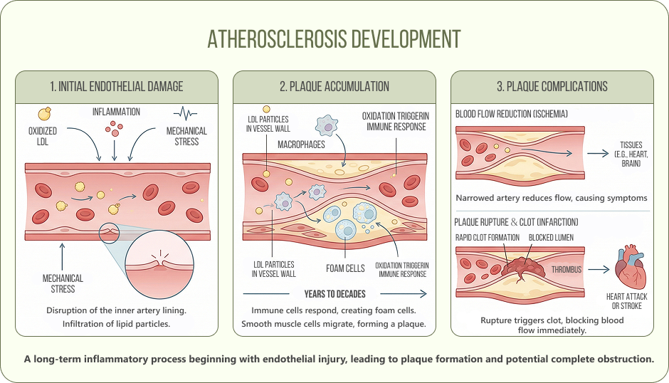 The process starts with endothelial damage: something, whether it’s oxidized LDL, inflammatory signaling, or mechanical stress, disrupts the thin inner lining of an artery. LDL particles infiltrate the vessel wall, get oxidized, and trigger an immune response. Macrophages try to clean up the mess, become engorged with lipids, and transform into foam cells. Over years and decades, this accumulates into a plaque.