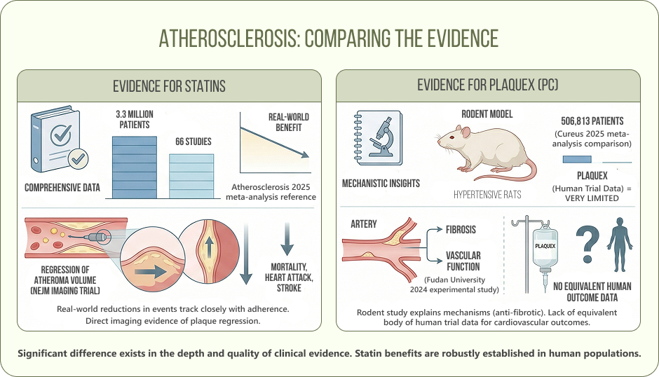 Bottom line on the evidence: statins have large-scale RCT outcome data. Plaquex has experimental and observational data supporting its membrane-level mechanism. Both approaches are grounded in real data, but differ significantly in scale and clinical evidence.