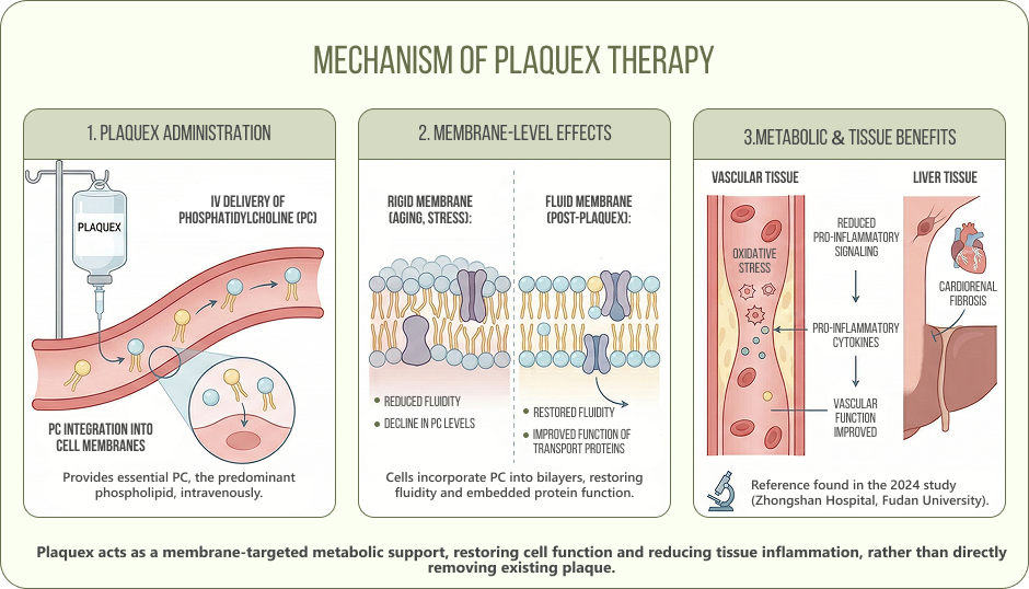 What Plaquex is not: it doesn’t inhibit cholesterol synthesis, it doesn’t prevent platelet aggregation, and it isn’t an artery-clearing or plaque-dissolving therapy. Those descriptions misrepresent the mechanism. Plaquex IV therapy for atherosclerosis and heart disease is used clinically as a membrane-targeted, metabolic support intervention, not as a cardiovascular treatment in the conventional pharmacological sense.