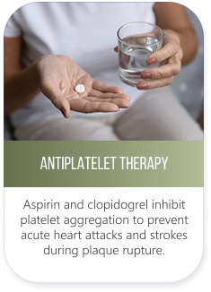 Aspirin and clopidogrel reduce platelet aggregation, lowering the risk of clot formation when a plaque ruptures. They don’t change the plaque itself or reduce LDL. Their role is specifically about preventing the acute event, the moment when a ruptured plaque triggers a heart attack or stroke.