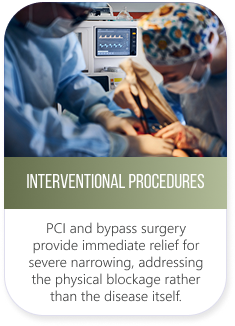 When arterial narrowing is severe or an acute event has occurred, percutaneous coronary intervention or bypass surgery mechanically restore blood flow. These address the downstream consequence of atherosclerosis rather than the underlying disease process.