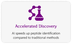 Traditionally, peptide drug discovery has been a slow and resource-intensive process, with high rates of failure. Now, tedious research and lab-based screening is being augmented by AI, reducing time to discovery by offering a more efficient and predictive approach. With AI, massive data bases can be rapidly scanned to identify novel peptide sequences with specific properties, such as high affinity for binding, selectivity, and minimal toxicity, transforming the process from trial-and-error to quick and precise discovery.