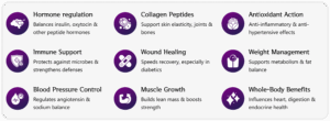 - Immune support – Peptides can destroy microbes and serve as alternatives to antibiotics, especially for fighting resistant bacteria..